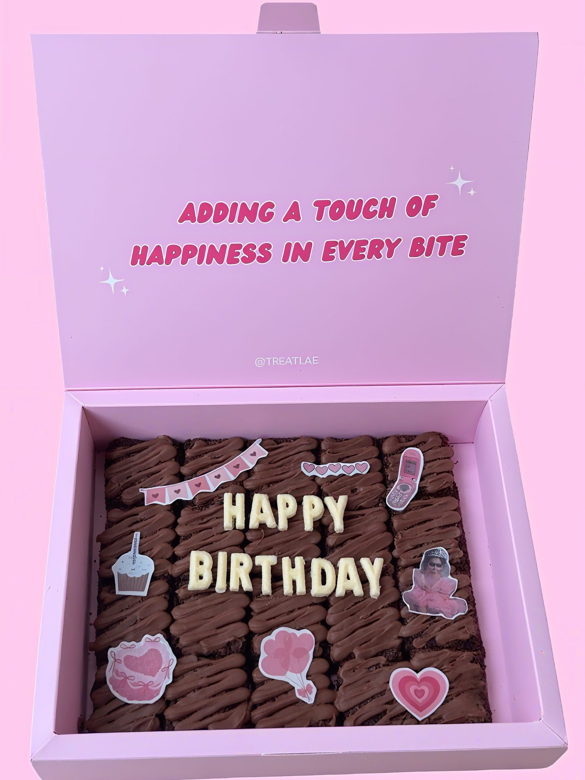 20 pcs of milk chocolate brownie with customized chocolate message + birthday theme stickers